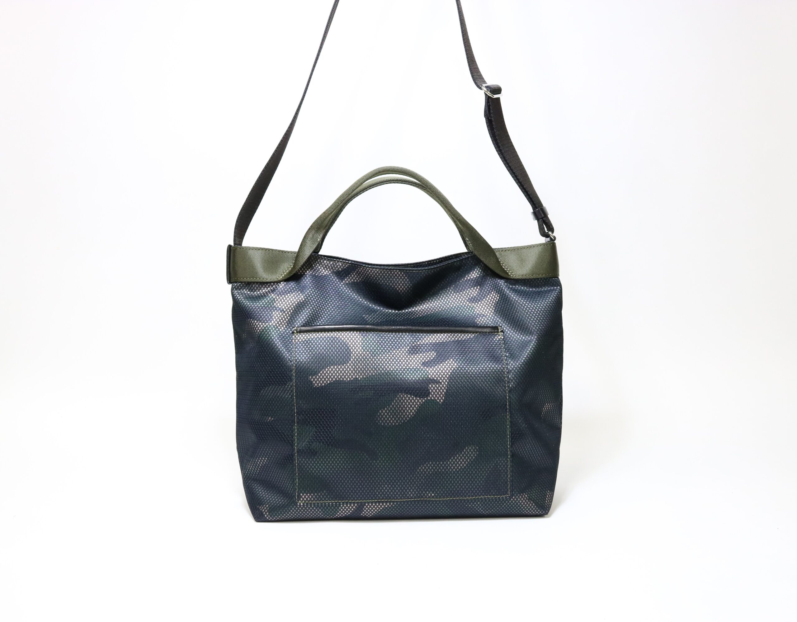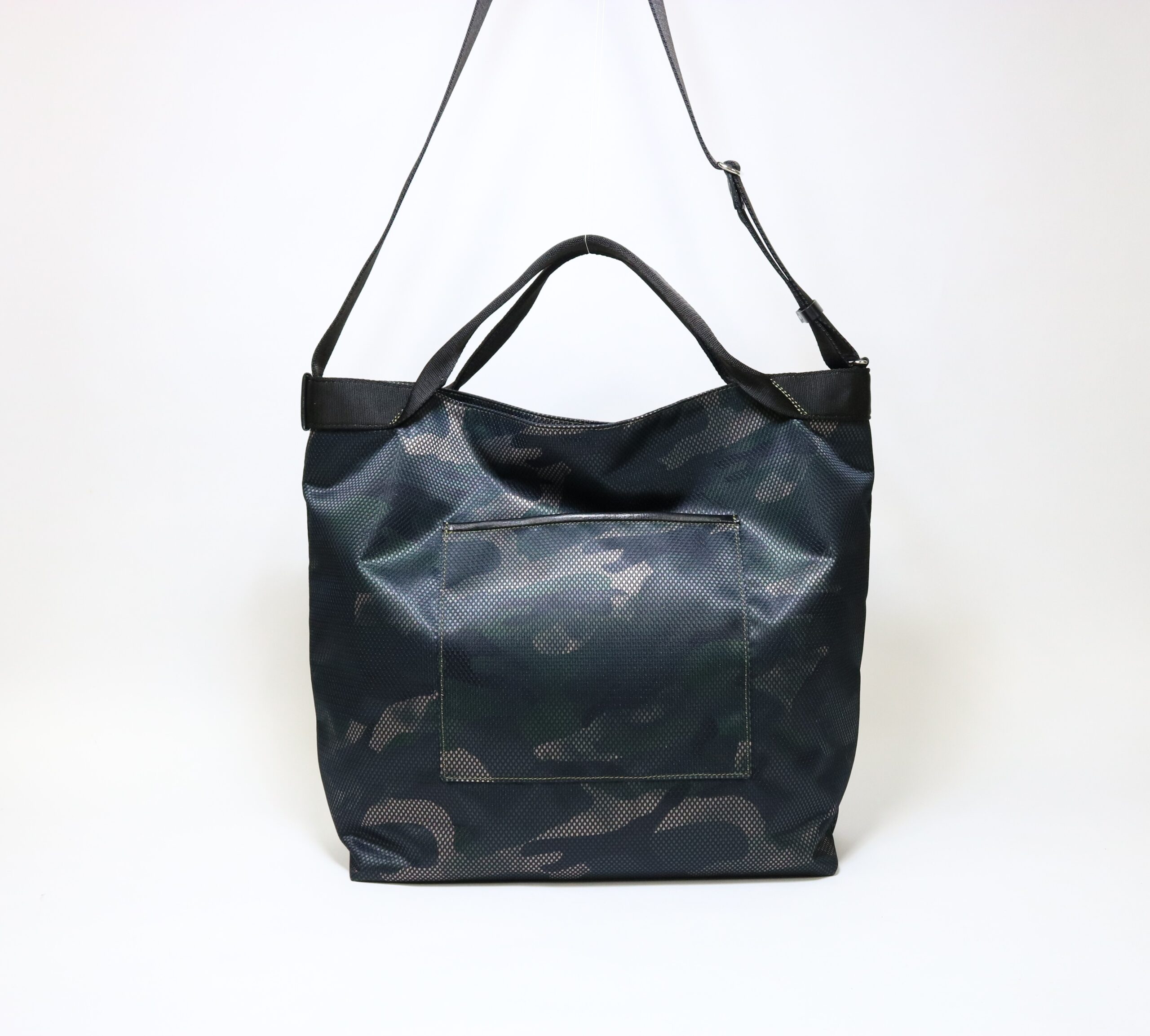カモフラージュ柄のサテンに黒メッシュを重ねた個性的な生地です。 メッシュから覗くサテンの艶は都会的で上品な大人の雰囲気を醸し出しています。 全体的に重厚な印象をうけますが、手触りはソフトで驚くほど軽量です。 遊び心と実用性が共存した生地です。